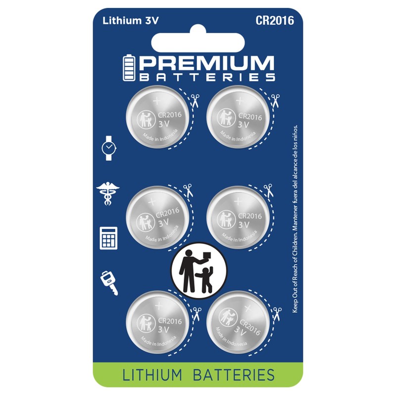 Premium Batteries CR2016 Battery 3V Coin Cell Child-Safe (6 Pack)