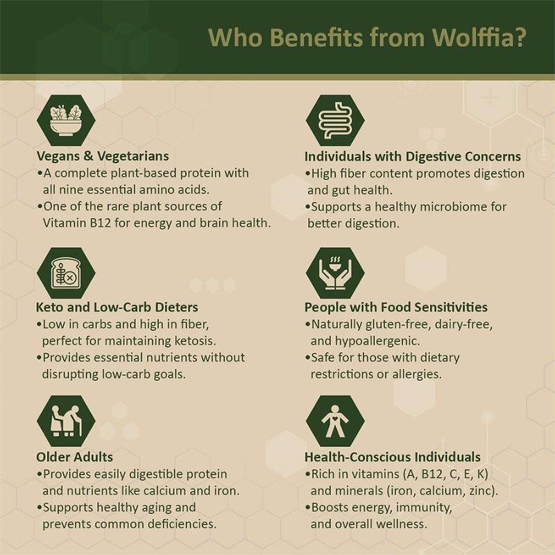 - Vegan & Plant-Based Protein: Ideal for vegans, vegetarians, and anyone looking to add a sustainable, plant-based protein to their diet. With a complete amino acid profile, Wolffia provides a high-quality protein source comparable to animal proteins.