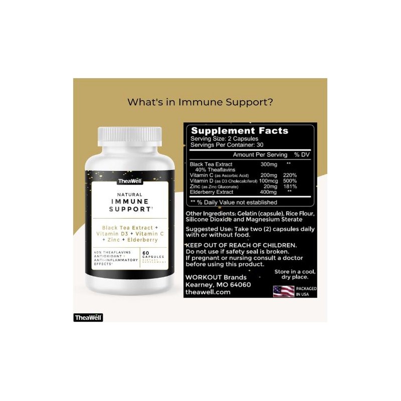 TheaWell Natural Immune Support is the first immune supplement to combine the goodness of black tea with powerful doses of Vitamin D3, Vitamin C, Zinc and Elderberry. Our proprietary black tea extract ingredient technology has been shown to support immune health while providing strong antioxidant and anti-inflammatory effects.