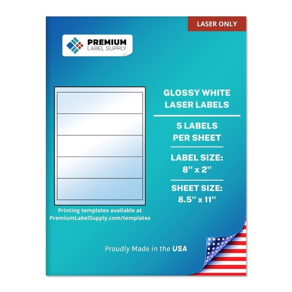 Premium Label Supply Glossy White Water Bottle Sticker Labels – NOT Waterproof – 8" x 2" – (5 Labels/Sheet) (Glossy White for Laser Only, 50 Labels)