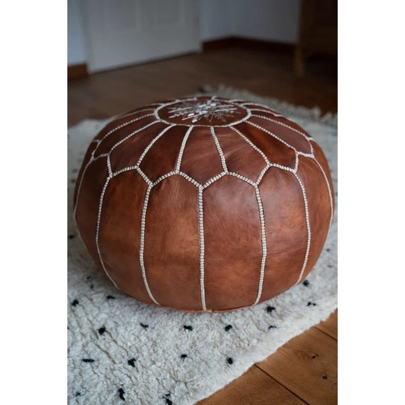 Premium Moroccan Leather Pouf - Handmade - Delivered Stuffed - Ottoman, Footstool, Floor Cushion (Cognac Brown)