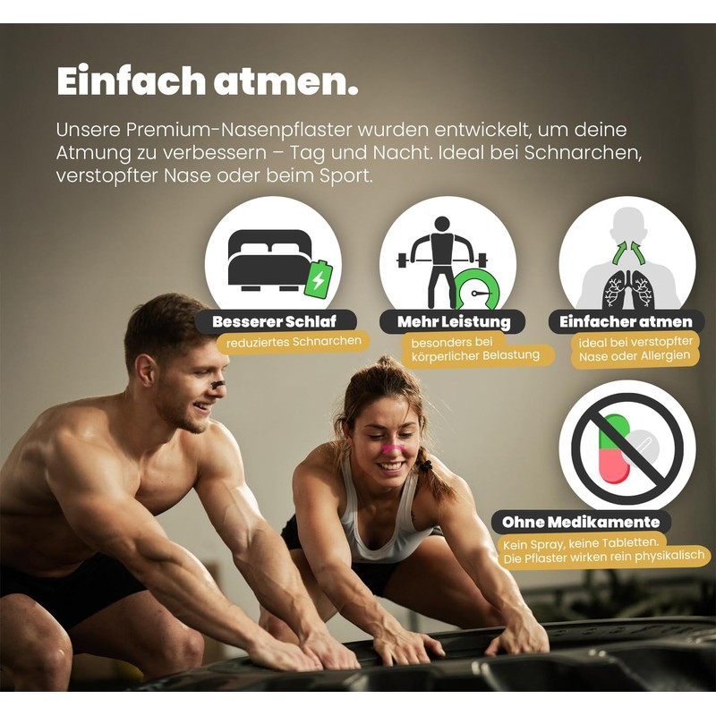 - Improved nasal breathing: our nasal patches gently open the nasal passages, facilitate breathing and reduce snoring and nasal congestion.