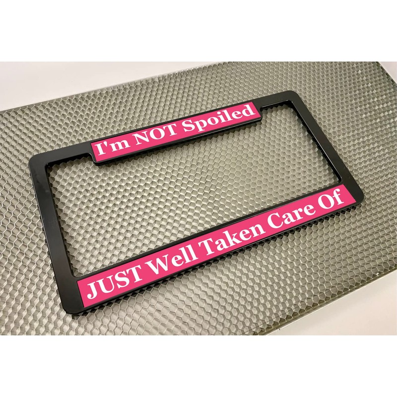 - LASER ENGRAVING TECHNOLOGY - Very Durable, High Quality product. Please note: this isn’t a cheap printed sticker, the message of your choice will be laser engraved into UV stable and Weather Resistant outdoor-grade American-made acrylic and then bonded to the frame with an exterior grade oil-resistant 3M adhesive. Your custom frame will not fade, rust or tarnish.