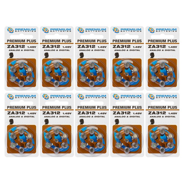 Premium Plus Size 312 1.45V Hearing Aid Batteries (60 Pack) + Battery Buddy