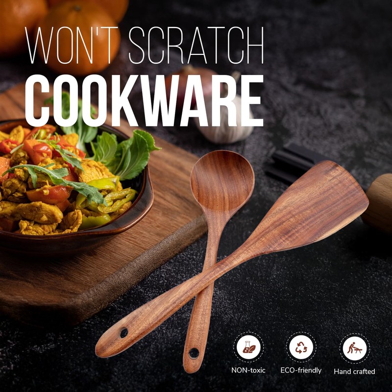 - ECO FRIENDLY: Our utensil set is made of 100% natural teak wood making it eco friendly and healthy for use in cookwear. This wooden utensils set is also completely biodegradble and decays fast than plastic ones.