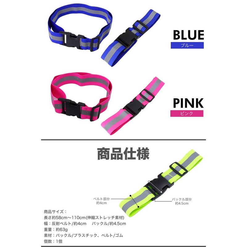 - Length: Approx. 22.8 - 43.3 inches (58 - 110 cm) (elastic stretch material); Width: Reflective belt: Approx. 1.8 inches (4.5 cm); Buckle: Approx. 2.2 inches (5.5 cm)