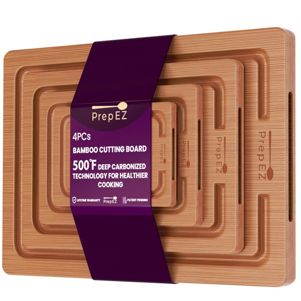 Prep EZ Heavy-Duty Cutting Boards for Kitchen – (Pack of 4) Wood Cutting Board Set – Bamboo Cutting Board Set with Deep Juice Grooves – Ideal for Chopping Meat, Vegetables & Fruits, etc.