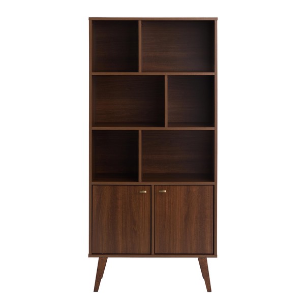 • RETRO BOOKSHELF: Features six open shelves and two door-covered compartments with four 8" long tapered solid wooden legs, brass finished knobs, and a cherry wood laminate finish to showcase a clean mid-century style