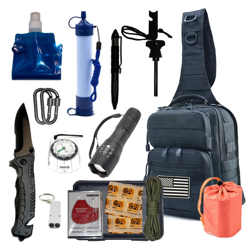 - This emergency pack comes in a tactical sling bag. There are multiple pockets with quality zippers. There are also MOLLE Straps to attach things to the outside.