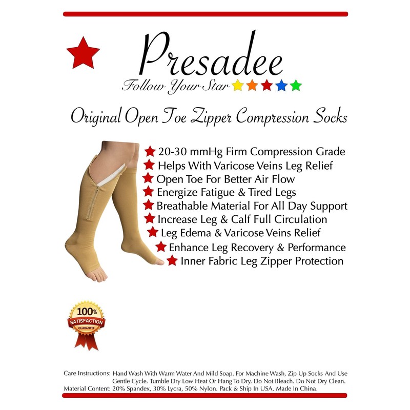 Provides 20-30 mmHg Compression Grade For Leg Swelling, Fatigue, Varicose Veins & Edema Relief. Our Original Open Toe Zipper Compression Sock Provides Full Length Support For Better Leg Circulations. The Compression Support Helps With Leg Swelling And Provides Quicker Leg Recovery. Helps Increase Full Circulations And Energize Leg From Fatigue Throughout The Day. Each Pair Comes With Inner Fabric To Help Protect The Zipper From Rubbing Against The Skin For Better Comfort. The Easy To Use Zipper Helps Putting On Or Taking It Off The Sock With Ease.