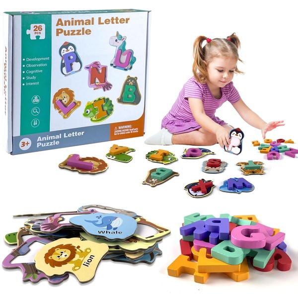 Preschool Games Alphabet, Letters Learning Educational Games, Alphabet Learning, Reading Learning Montessori Toy, Montessori Letters Wood, ABC Wooden Letters Animal Card Board Matching Puzzle for 3+