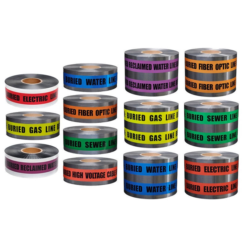 - Stock legends and colors include red color, CAUTION: BURIED ELECTRIC LINE BELOW; red color, CAUTION: BURIED HIGH VOLTAGE CABLE BELOW (available in 3 in. width only); orange color, CAUTION: BURIED FIBER OPTIC LINE BELOW; blue color, CAUTION: BURIED WATER LINE BELOW; green color, CAUTION: BURIED SEWER LINE BELOW; yellow color, CAUTION: BURIED GAS LINE BELOW; purple color, CAUTION: BURIED RECLAIMED WATER LINE BELOW.