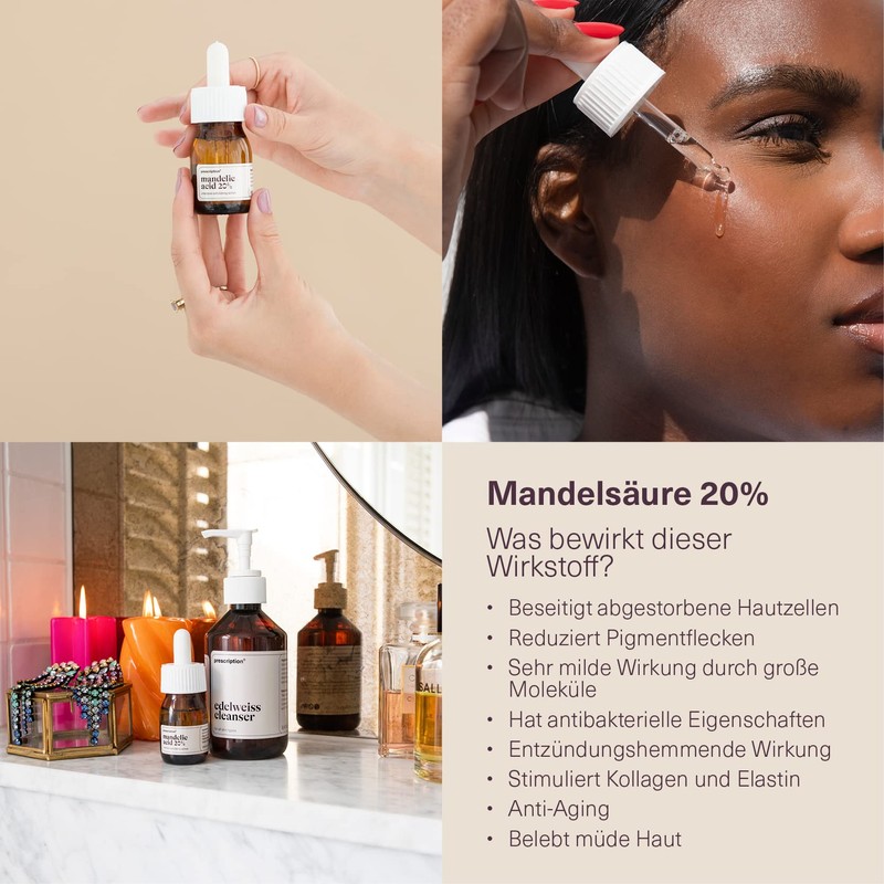 - Anti-ageing almond acid, no serum: this is not a serum, but better: a single high-dose active ingredient that really solves your skin problems and helps to achieve your skin goal. With our mandelic acid active you get an effective additive for exfoliations and any cleansing foam for thorough cleansing and stimulation of collagen and elastin.