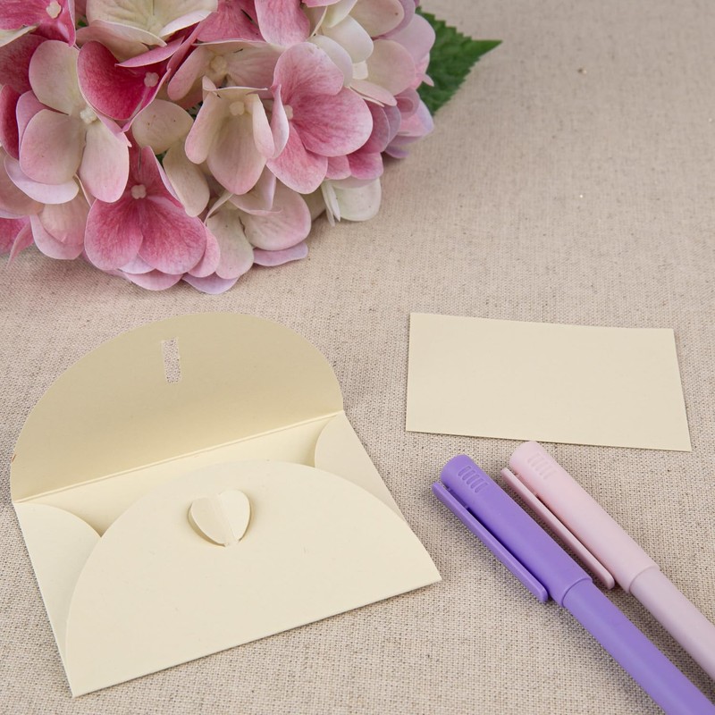 - Blank cards and mini envelopes with heart closure, pre-folded envelope for designing and folding yourself – the mini envelopes and the card blanks are flat unfolded