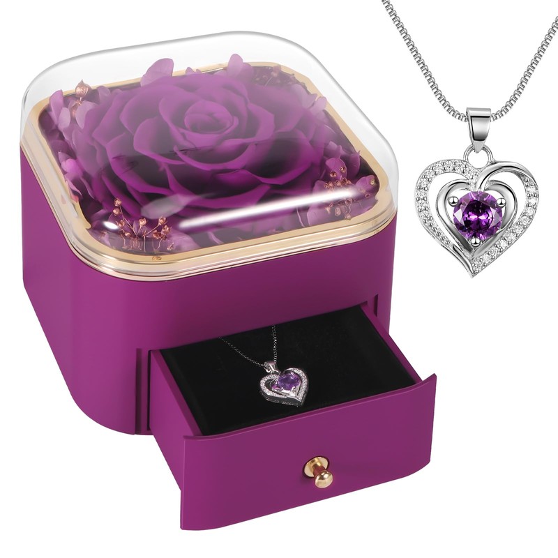 - ❤️【Beautiful Rose Forever Flower Set】: Exquisite eternal rose gift set includes preserved real purple roses gift jewerlry box and a heart necklace. The gift box has a hidden drawer where you can also store other jewellery or rings. The acrylic cover is removable, remove the cover and you can really feel the fresh rose scent.
