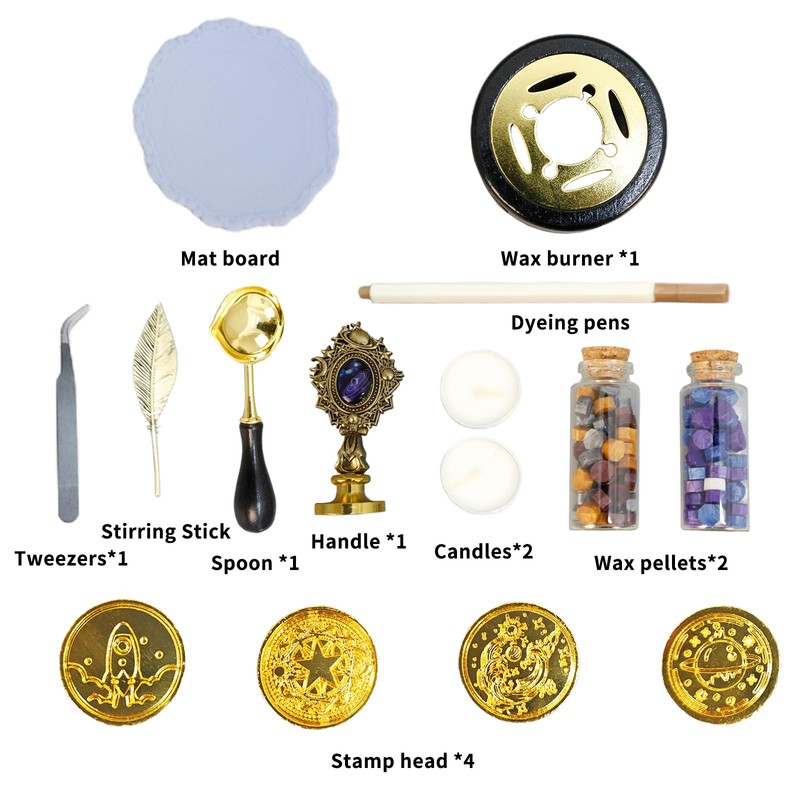 - WHAT YOU Will GET: Our wax seal stamp kit includes a stripping plate, a coloring pen, a feather stirring needle, 2 candles, 2 bottles of wax pellets, tweezers, 4 stamp heads, a starry sky handle, a wax spoon, a melting pot, and exquisite packaging.