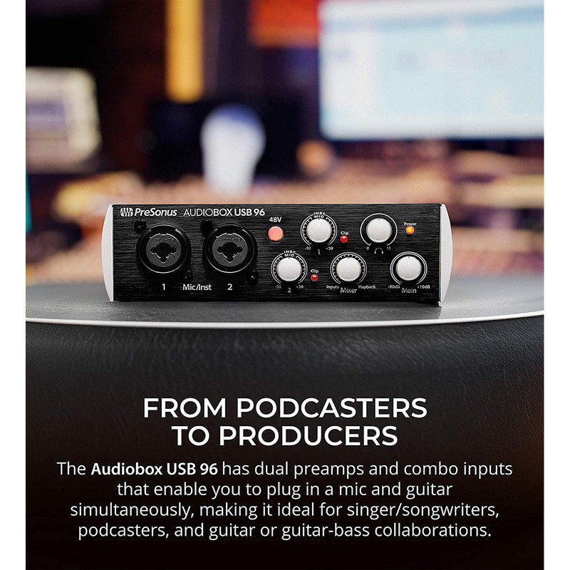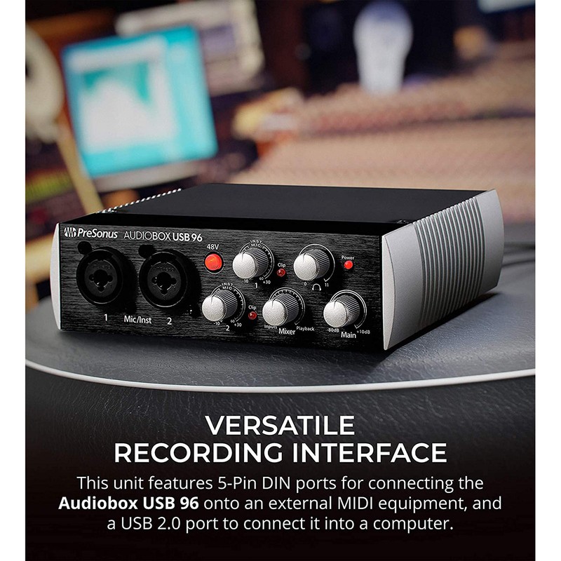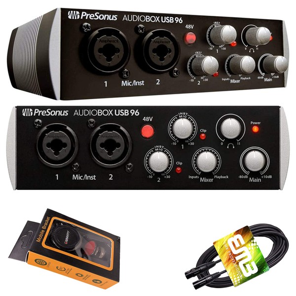 PreSonus AudioBox USB 96 Digital Audio Interface (Black) 96 kHz converters with USB Bus-Powered interface's Two Class A MIC/LINE/Instruments Preamps with Gravity Phone Holder and XLR Cable Bundle