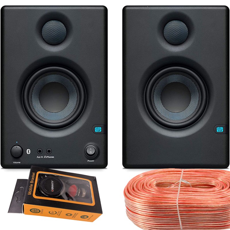 PreSonus Eris E3.5 BT-3.5-Inch Near Field Studio Monitors with Bluetooth 50W Power (25 W/Side) Class AB Amplification with EMB Speaker Wires and Gravity Phone Holder Bundle