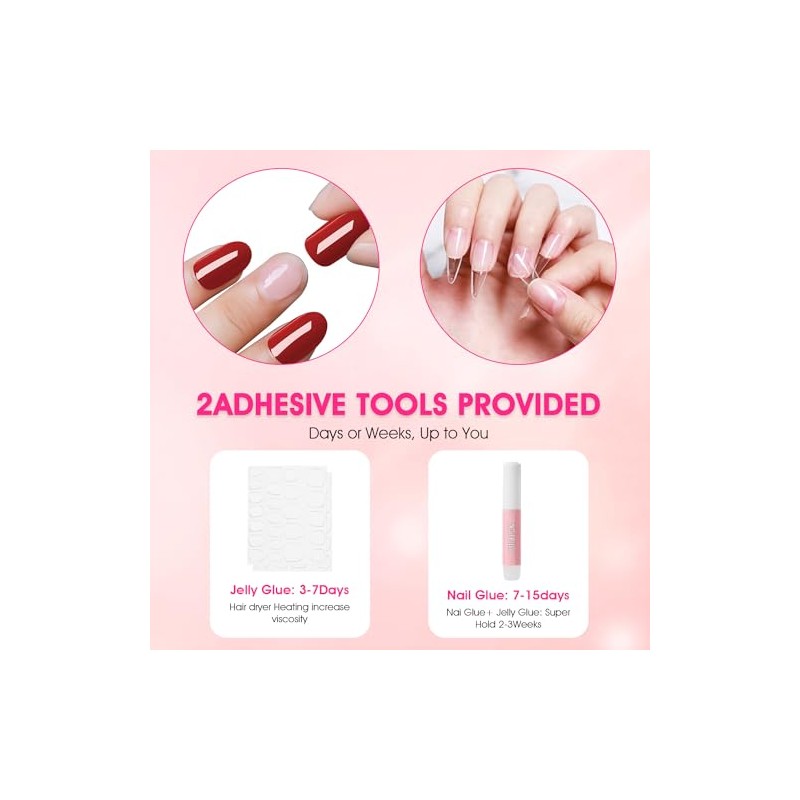 - What You Will Get: 24PCS acrylic nails, nail glue, adhesive tabs, a double-sided nail file, a cuticle stick, and a prep pad; Suggest: For over 2 weeks, use nail glue adhesive tabs together; Strong enough to last for 7-15 days if using glue; Nail jelly glue is better for temporary task, easy to remove and more friendly to natural nails