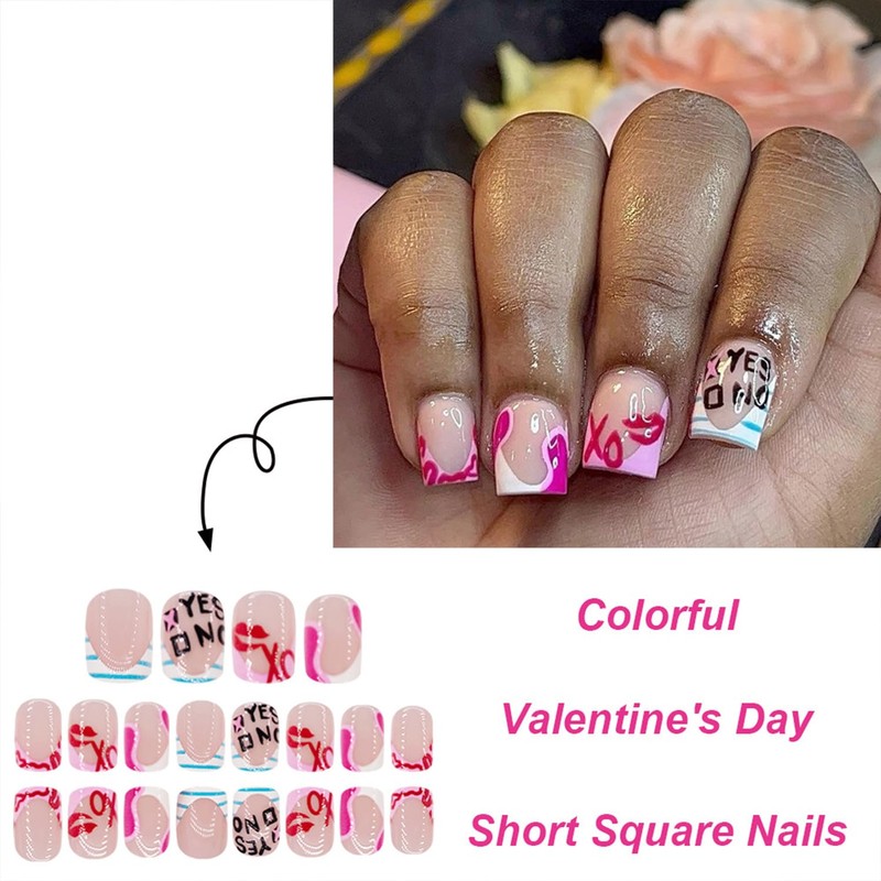 Press on Nails Letter Red Lips French Tip Fake Nails Short Square Glue on Nails Romantic Acrylic Stick on Nails for Women