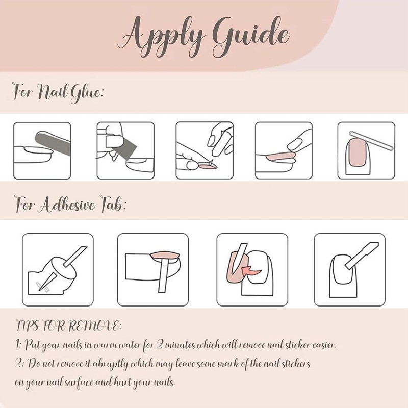 - Easy to apply and remove: To apply, cut, file and clean the surface of your nails first, apply glue to the back of the false nails, align with the cuticles and press for 20 seconds and finally hold it to the perfect length. To remove, first pull the nail edges with a manicure stick, dip enough false nail remover into the seam, wait a few minutes for them to be soft, and finally remove the false nails.