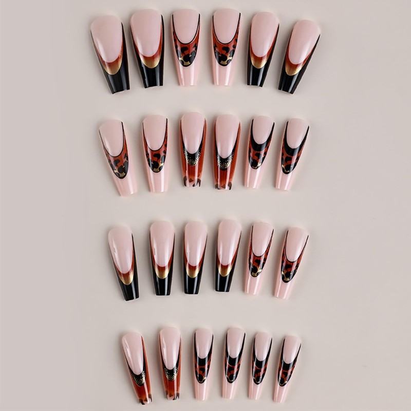 Press on Nails Long Coffin Glossy Full Cover Acrylic Extra Long Square French False Nails with Leopard Print Designs Artificial Ballerina Fake Nails with Glue Stick on Fingernails for Women Girls