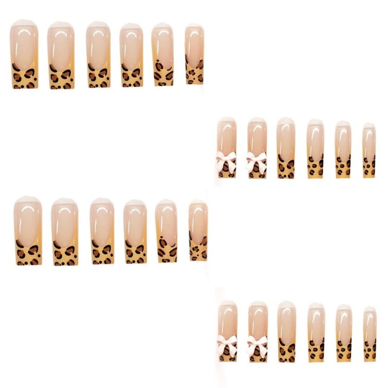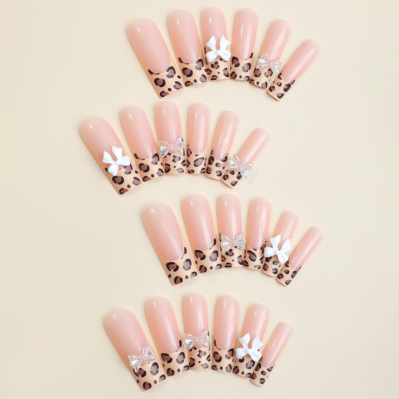 Press On Nails - Long Square French Tip False Nails with Brown Cheetah Design, 3D Bow Charm, Glossy Acrylic Finish, 24pcs