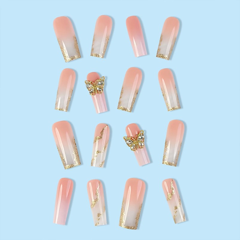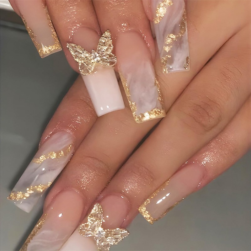 Press on Nails Long Square Gradient Marble Fake Nails with Gold 3D Butterfly Rhinestone Designs Full Cover Artificial Glue on Nails for Women
