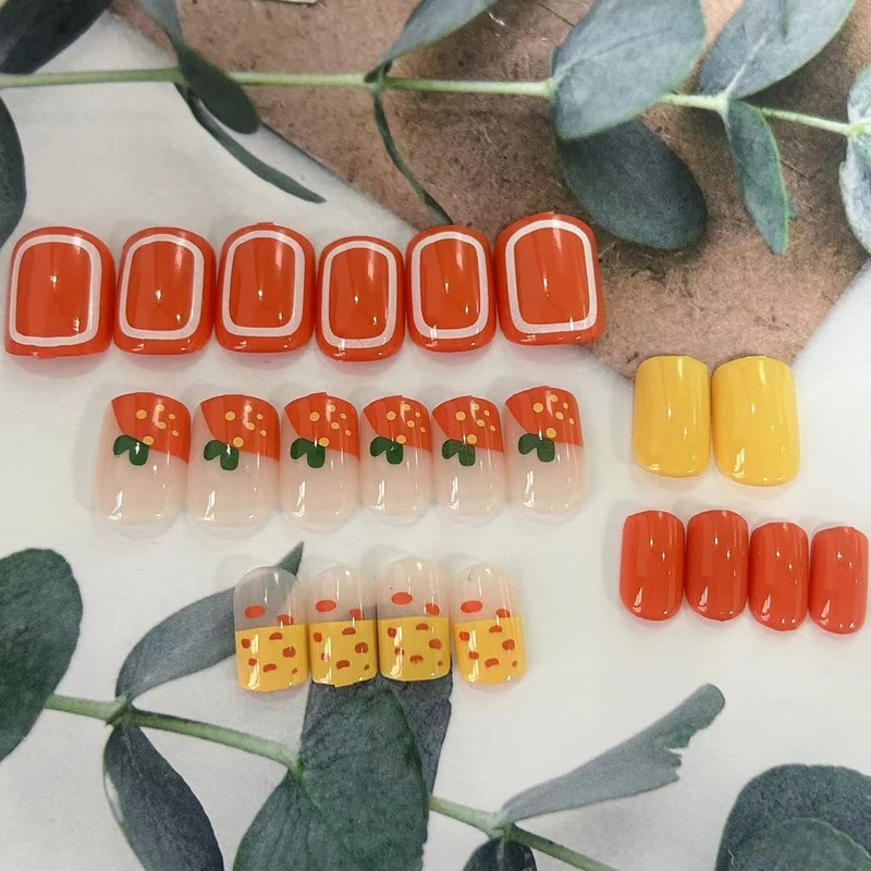 • Artificial False Nails: Fruit patterns square press on nails accessories are made of acrylic, it is environmentally protection, non-toxic, odorless. Have strawberries oranges patterns 2 colors yellow and red. They are durable and can last for 1-3 weeks.