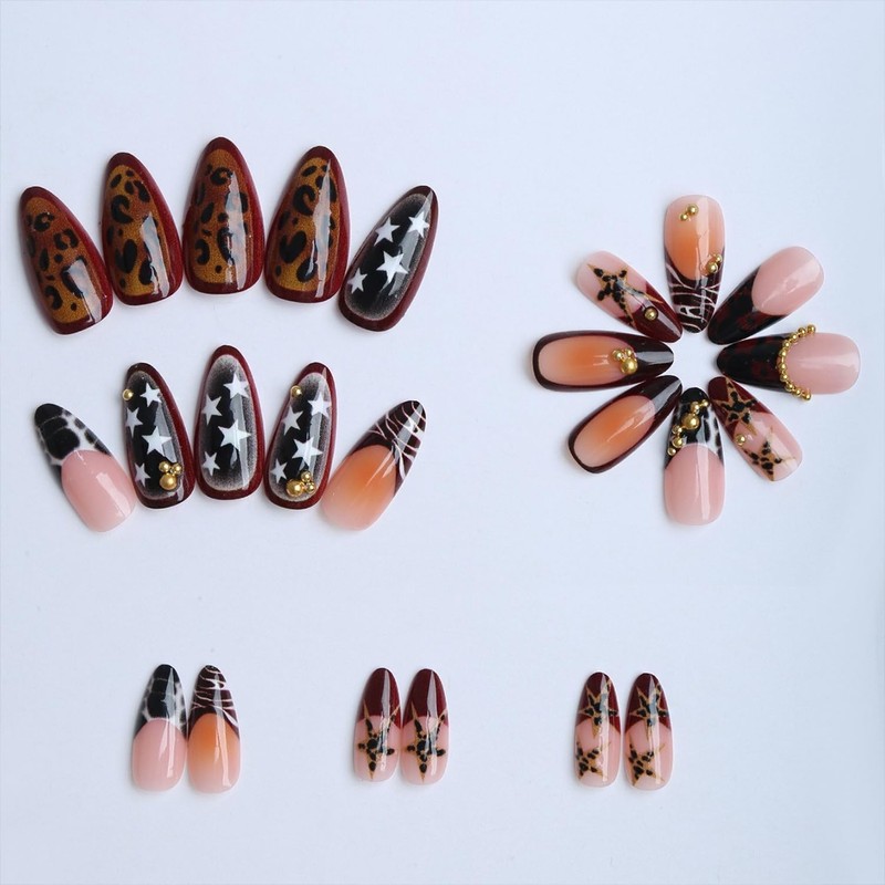 Press on Nails Medium Almond French Tip Fake Nails 3D False Nails with Leopard Print Stars Golden Steel Beads Designs Red Brown Autumn Stick on Nail Glossy Glue on Nail for Women Girls 24Pcs