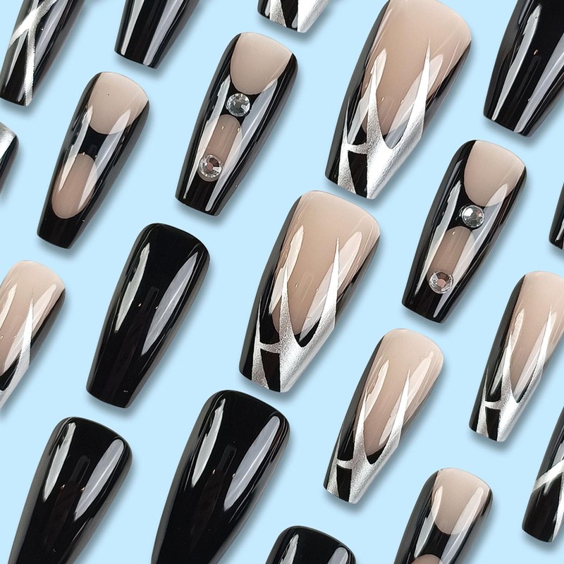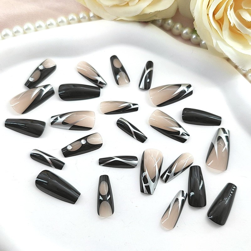 Press on Nails Medium Coffin Fake Nails French Tip Nails Press ons Glossy Glue on Nails Black False Nails with Rhinestones Silver Irregular Pattern Designs Artificial Stick on Nails for Women 24Pcs