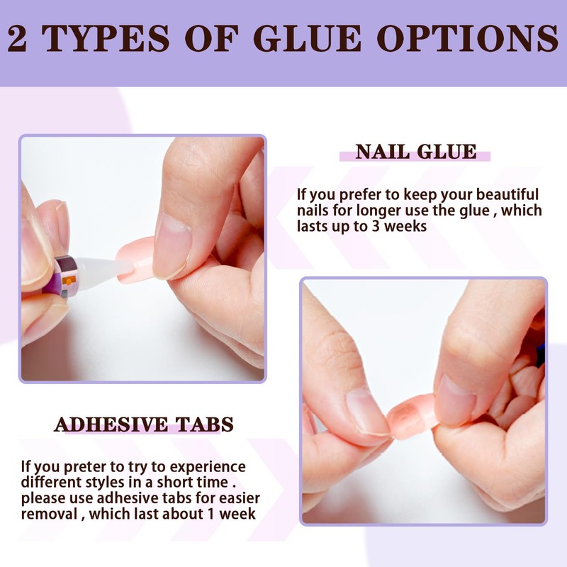 - 💥Two ways to wear it: For weeks or days at a time - the choice is yours! These reusable press-on nails medium use glue if you want a long-lasting effect that lasts longer than 14 days. If you want to experience a different style in a shorter period of time, use the adhesive tab, which is easier to remove!