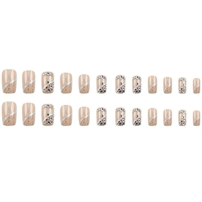 Press on Nails Medium Square Fake Nails Glitter French Acrylic False Nails with Designs Rhinestones Nails Press ons Full Cover Artificial Glue on Nails Natural Stick on Nails for Women 24Pcs