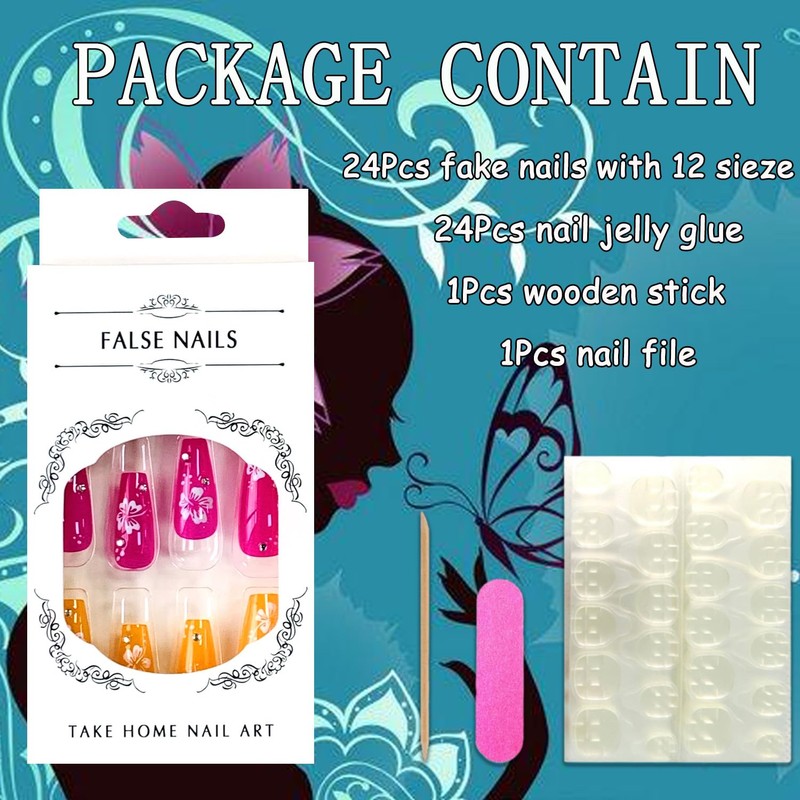 - Package: You'll get 24 french false nails in 12 sizes. 1 mini nail file, 1 small wooden stick, 1 piece of nail glue sticker. Glue on nails are perfect for most people's nails