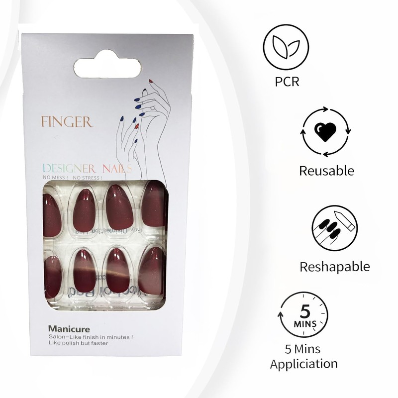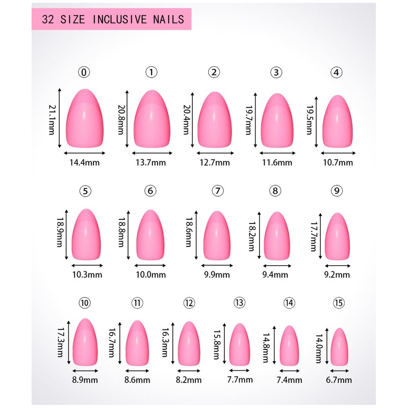 - 32 Nails in 16 Sizes - Various nail sizes ensure a totally custom fit,Each set comes complete with nail glue, double-sided nail file, cuticle stick, and alcohol pad.