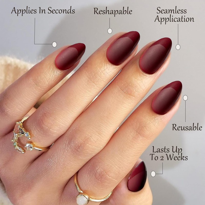 - Trendy Matte French Tip Almond Nails - this trendy matte nail set features a glossy french tip design in a stunning dark red-wine inspired color.