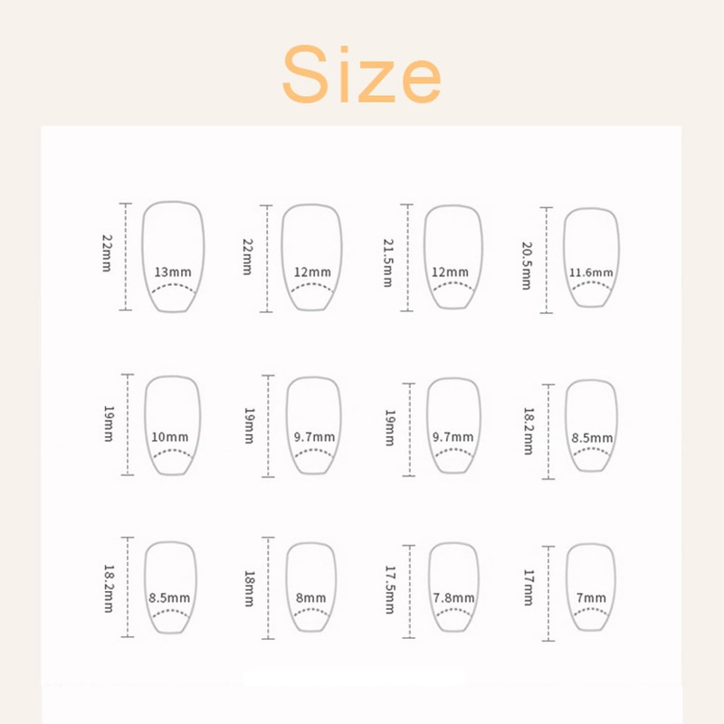 - 【Package】: There are 24pcs of short coffin artificial finger nails 12different sizes, 1 mini nail file, 1 small wooden stick, 1 nail sticker in the package.(Jelly glue doesn't last as long as liquid glue, but it can make fake nails reusable. Please use suitable glue according to different occasions).
