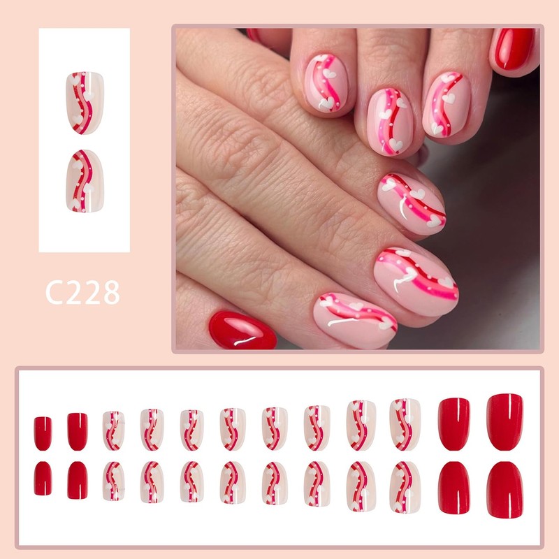Press on Nails Short Oval Stripe Love Heart Design French False Nails Valentine's Day Short Fake Nails Full Cover Glossy Coffin Nails Artificial Acrylic Nail, Glue on Nails for Women 24Pcs