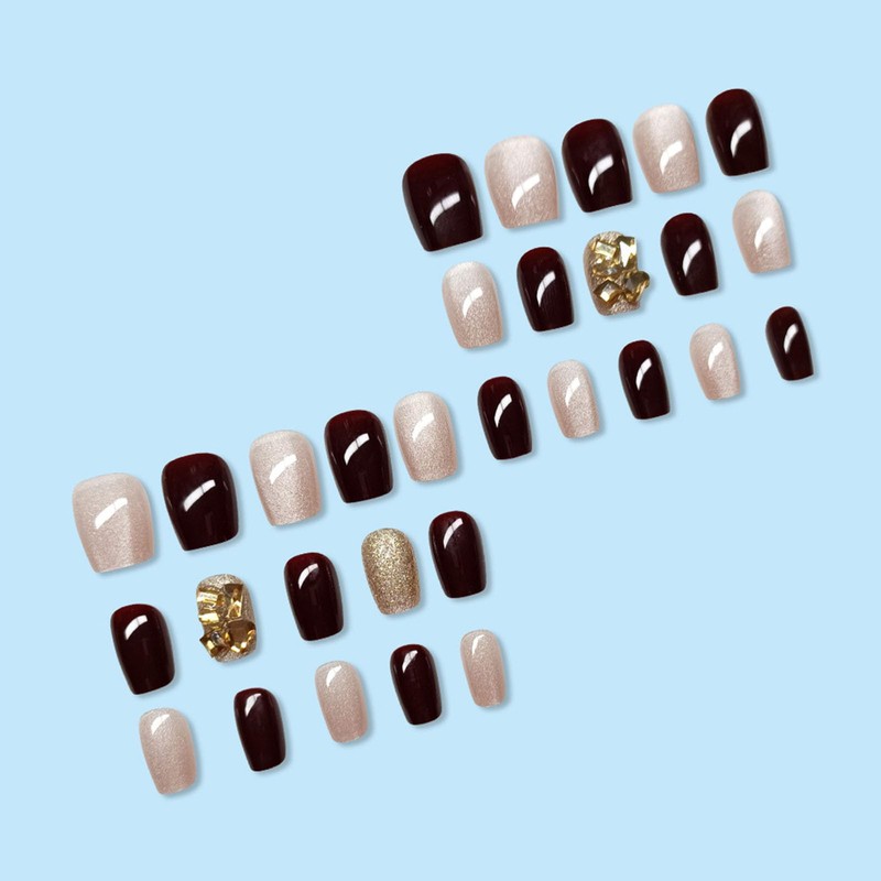 Press on Nails Short Square Fake Nails Cat Eye Acrylic Nails Glitter Glossy Glue on Nails Burgundy False Nails with Golden Glitter Heart Rhinestones Designs Artificial Stick on Nails for Women 30 Pcs