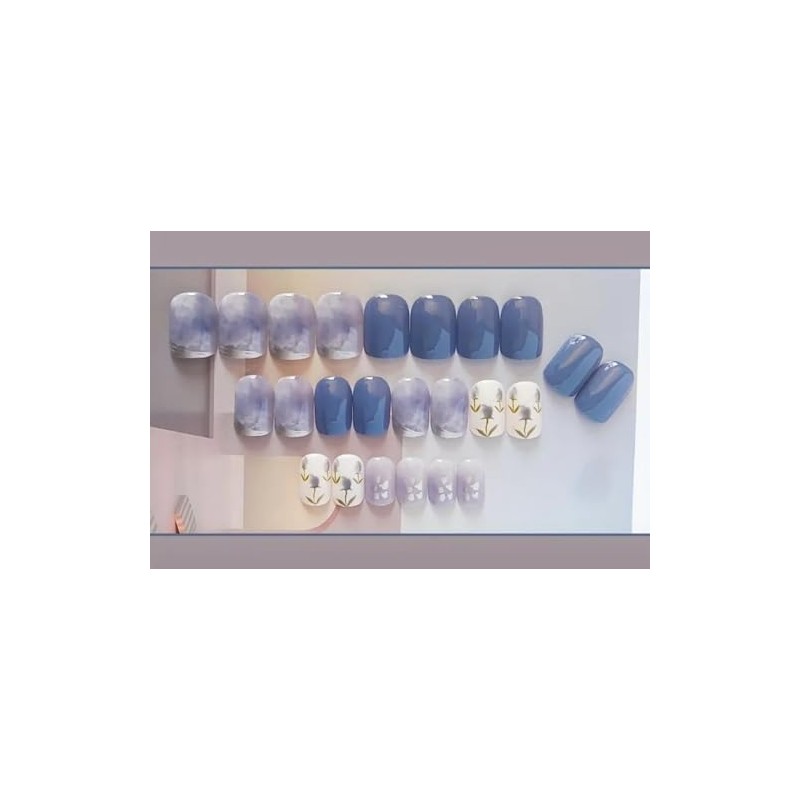 Transform your nails into a stunning work of art with this set of 24 press-on nails featuring an elegant combination of navy blue, marble effects, and delicate tulip patterns. The square-shaped nails come in a glossy finish that catches the light beautifully, creating a sophisticated and professional look. Each nail is crafted from durable plastic material and designed for full coverage, making them perfect for special occasions or everyday wear. The set includes a variety of sizes to ensure a custom fit for most nail beds. The design showcases a harmonious blend of solid navy blue nails, dreamy marble-effect pieces in soft purple hues, and accent nails adorned with charming tulip designs on a white base. Some pieces feature trendy metallic foil accents for added sparkle. These short-length press-on nails are ideal for those who prefer a practical yet stylish manicure that doesn't interfere with daily activities. Easy to apply and perfect for DIY nail enthusiasts, these false nails offer a salon-quality look from the comfort of your home.