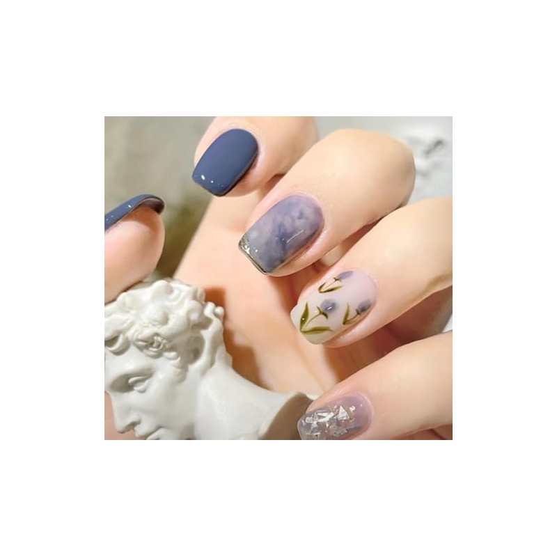 • DESIGN FEATURES: Set of 24 press-on nails featuring an elegant mix of navy blue, marble effects, floral tulip patterns, and shimmer accents in a square shape