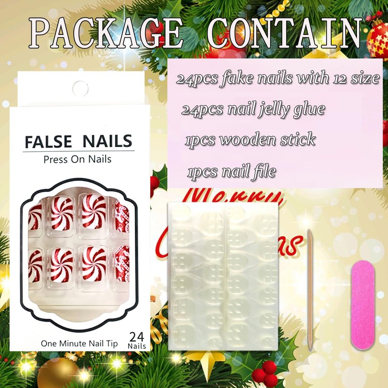 - Includes Tool Kit: You'll get 24 cute Xmas false nails in 12 sizes. 1 mini nail file, 1 small wooden stick, 1 piece of nail glue sticker. Christmas glue on nails are perfect for most people's nails