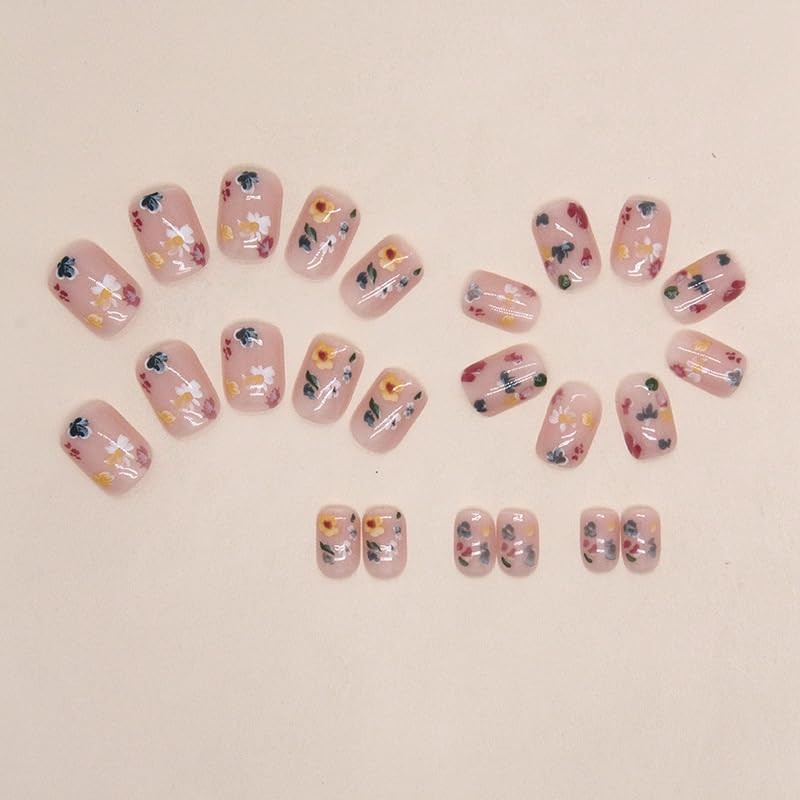 Press On Nails with Nail Glue, 3D Peach Flower Summer Cute Designed in Glue on Nails, Fake Nails, Short Square Almond Ballet Shape for Stick On Nails on 24PCS,Nude Little Flower