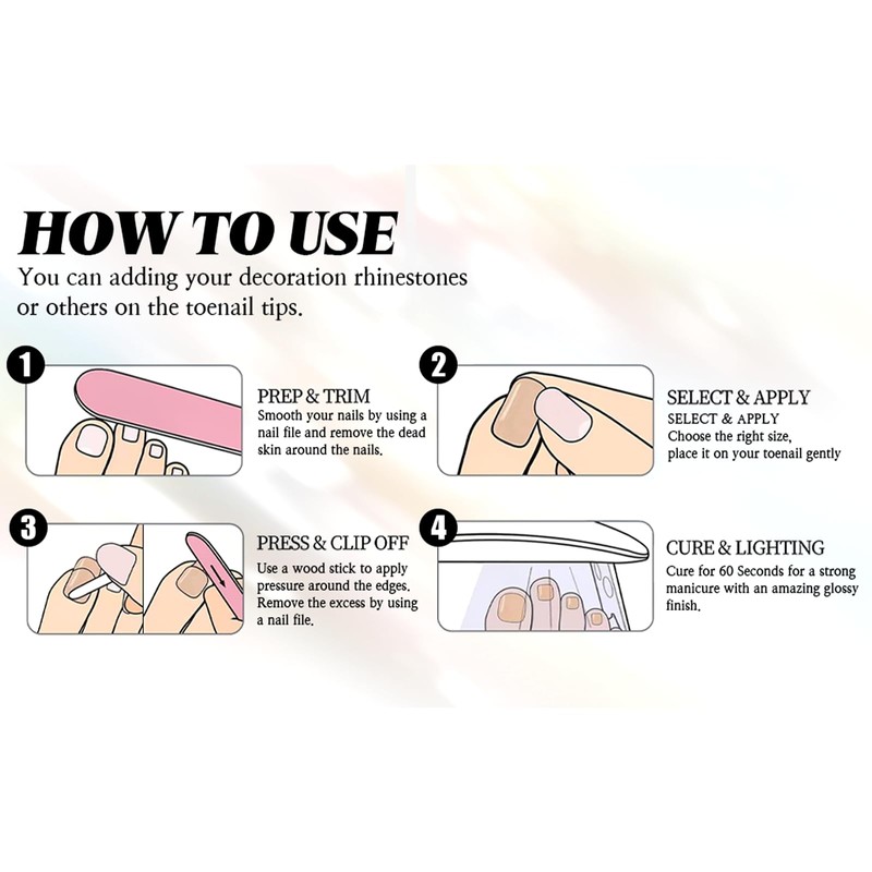1. Try to keep away from water from 1-2 hours, fake nails will be last longer time.