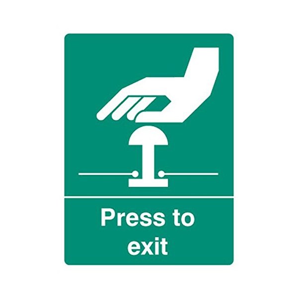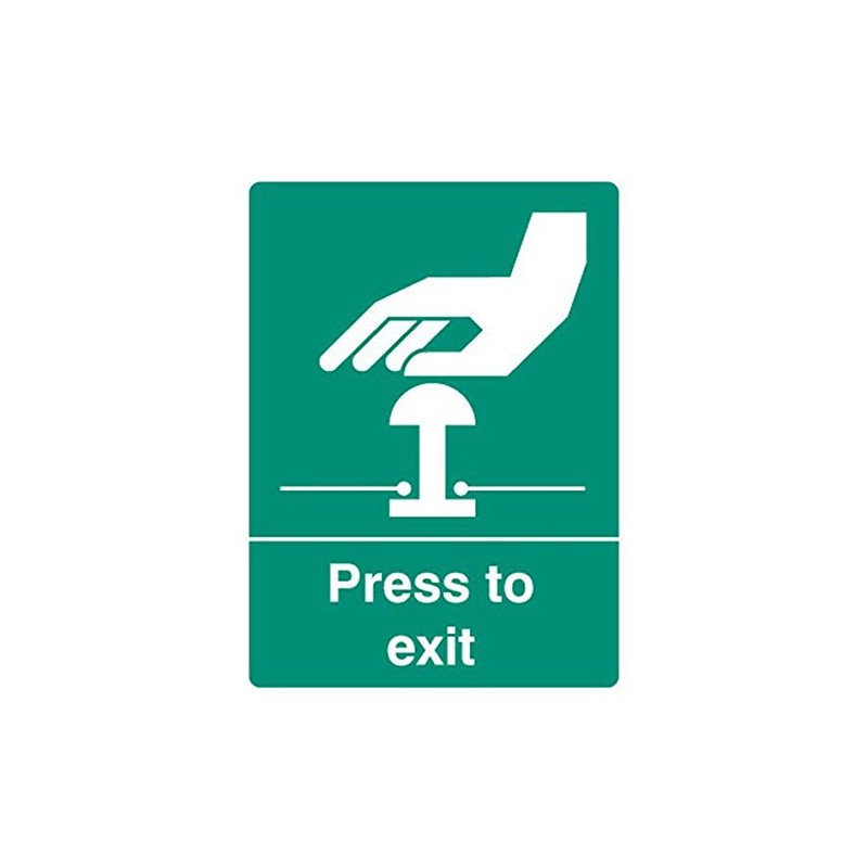Sign, PRESS TO EXIT, SAV, External height: 100 mm, External width: 75 mm, Sign colour: White on green, Sign legend: Fire instruction, Signs material: Vinyl, Sign type: Fire exit, Approval category: BS 5499