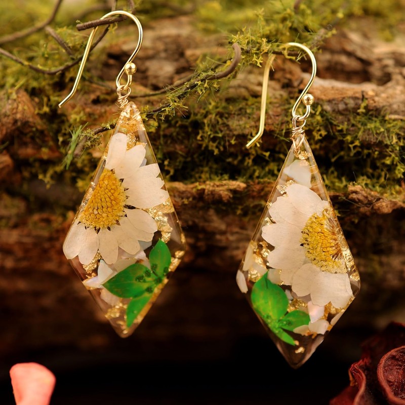 Pressed Flower Handmade Earrings Dangle Geometric Rhombus Sterling Silver Stud with Nature Fern Leaf, Rice Flower and Gold Foils in Resin Drop for Christmas