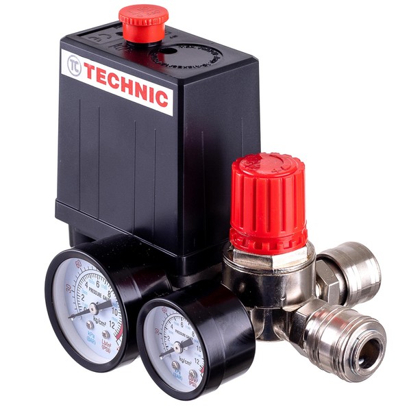 - Versatility: the pressure switch reducer fits most of the air compressors available. The device is equipped with two measuring indicators, so-called pressure gauges, two Euro quick couplings and safety valve. A version with copper contact up to 16 A.