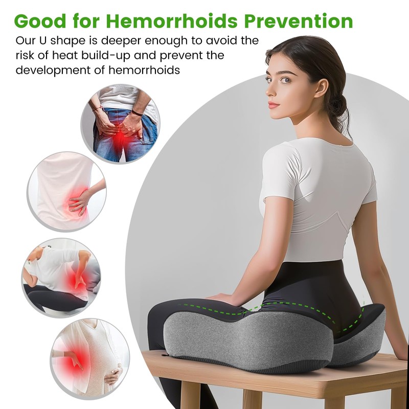 - PROPER CURVED DESIGN: Our seat cushion for lower back pain relief sees the proper curved lines around it to fully fit your butt and thighs, give your lower body a comfortable and sufficient support. Its 3D U-shape float your tailbone in the air to reduce the pressure for the body weight.