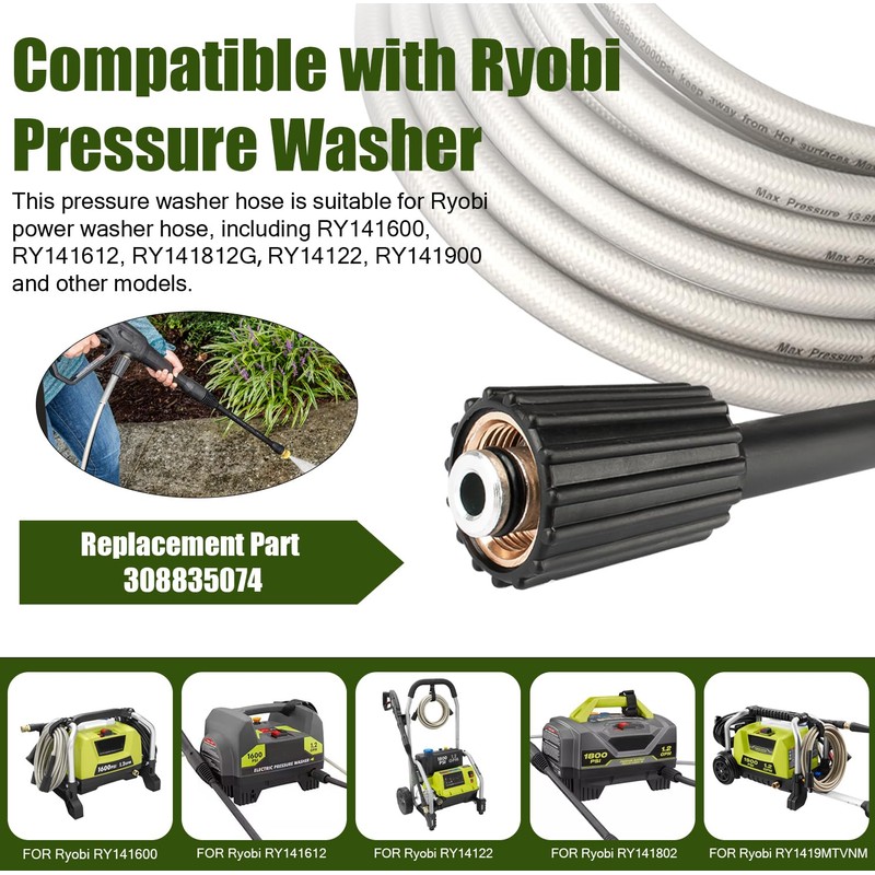 - Fits for Ryobi Pressure Washer: This pressure washer hose is suitable for Ryobi power washer hose, including RY141600, RY141612, RY141812G, RY14122, RY141900 and other models.