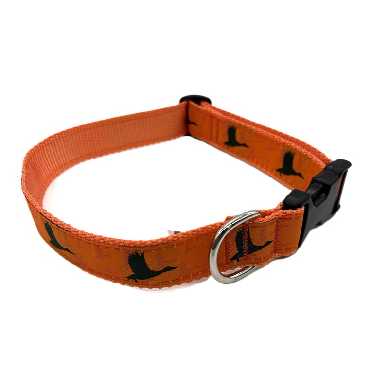 - These dog collars for your best furry friend have a bright orange nylon web backing with a repeating flying duck design. They make unique dog lover gifts for duck hunters or waterfowl enthusiast.